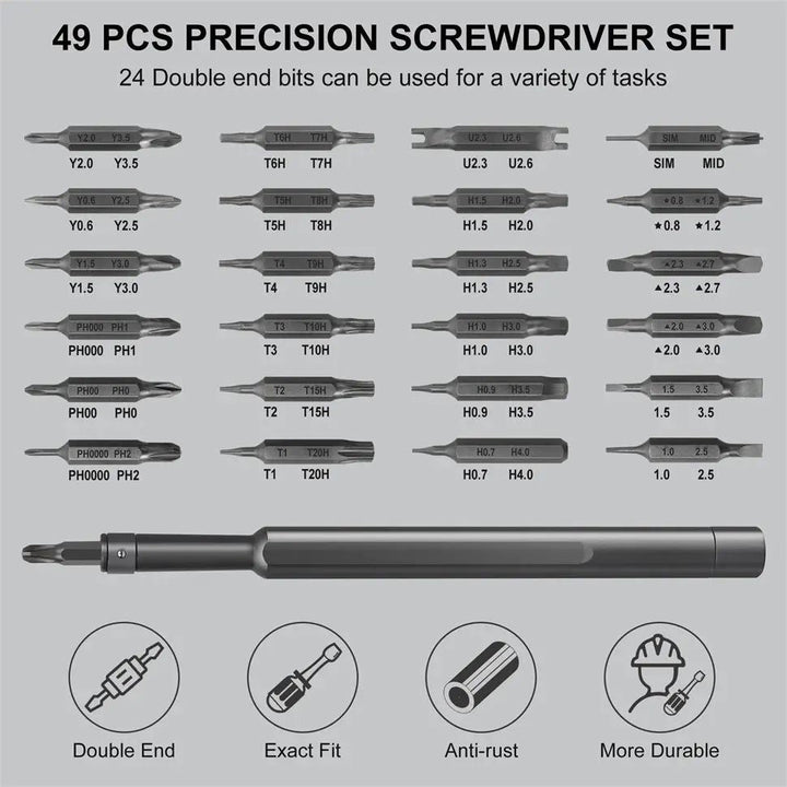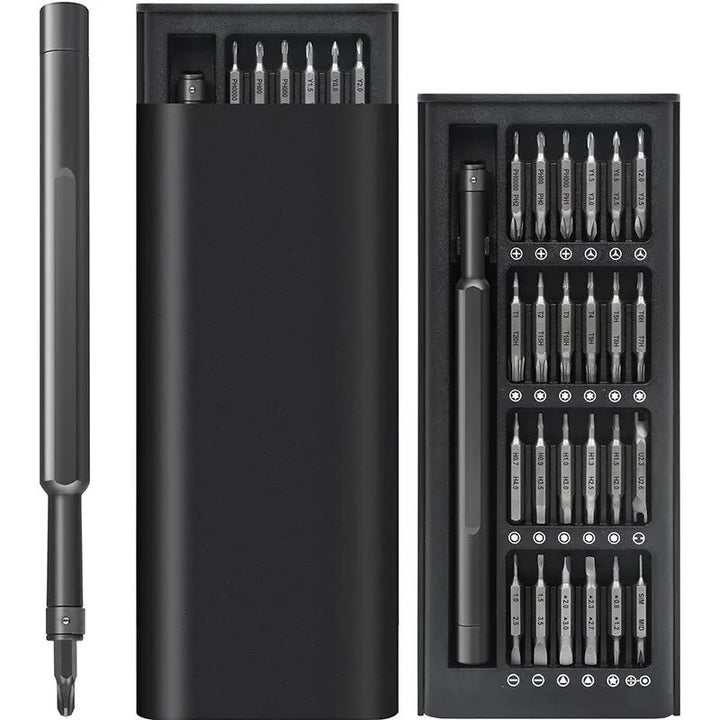 This sleek and compact 24-in-1 precision screwdriver set is designed for handling a wide range of small electronic repairs and DIY tasks. It comes in a stylish, durable magnetic storage case that securely holds all 24 bits and the screwdriver handle in place for convenient portability.